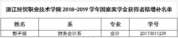 根据《教育部、财政部关于印发<本专科生国家奖学金评审办法>的通知》(教财函[2019]105号)、浙江省学生资助管理中心《浙江省高校国家奖学金、国家励志奖学金校内评审工作规程》等文件精神,因我校褚佳宁同学荣获2019年浙江省高职高专院校国家奖学金特别评选资格,需增补一个国家奖学金名额。在学生申请、各系奖助工作小组初审、学生处复审的基础上,报学校学生奖助工作领导小组,拟增补财务会计系郭子璇同学为2018/2019学年国家奖学金获得者人选。
