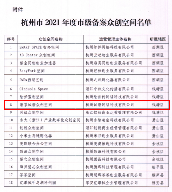 近日,杭州市科学技术局公布了杭州市2021年度市级备案众创空间名单,共有18家单位通过备案,我校浙茶诚澄众创空间成功入选。