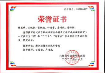 面向全校学生开展“劳动教育月”、“劳动教育周”、“劳动教育日”“劳动文化节”“纪念杭州926工匠日”“劳模工匠进校园大讲堂”“蓝精灵劳动能量营暑期社会实践”等特色品牌活动,月月有精彩。其中,“蓝精灵”劳动能量营暑期社会实践小分队所撰写的《关于绍兴市坝头山村农文旅产品的调查研究》调研报告在全国3000余篇作品中脱颖而出,获得2022年共青团中央“三下乡”、“返家乡”社会实践百篇优秀调研报告(含本科高校)“优秀调研报告”,成为学校唯一获奖作品。