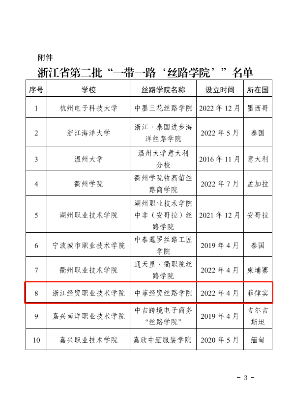 近日,浙江省教育厅、省商务厅公布了浙江省第二批 “一带一路‘丝路学院’”名单,我校牵头设立的“中菲经贸丝路学院”突破重围,成功入选。至此,学校设立的4所海外“丝路学院”,全部入选省级“一带一路‘丝路学院’”,数量位居全省首位!